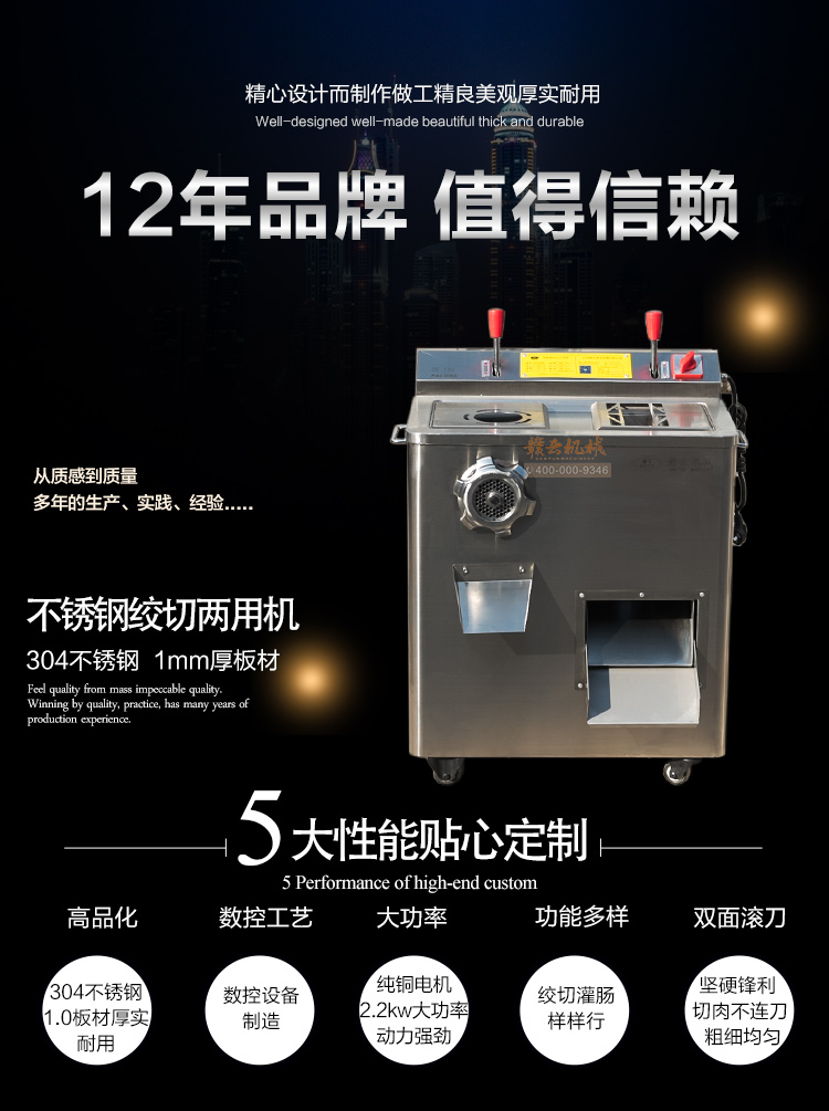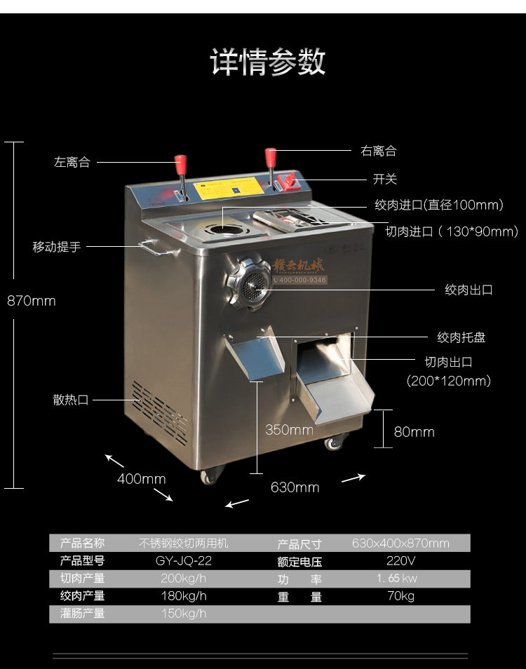 贛云2017款304不銹鋼絞切機上市,火熱開賣中,裝配2.2kw 大功率純銅電機,采用1mm標準厚304不銹鋼板材封裝,離合開關(guān)設(shè)計,絞肉切肉一體。適合高端酒店場所之用,同樣也適合品質(zhì)優(yōu)質(zhì)店鋪和檔口絞肉切肉之用。十二年品質(zhì)保證,值得擁有!