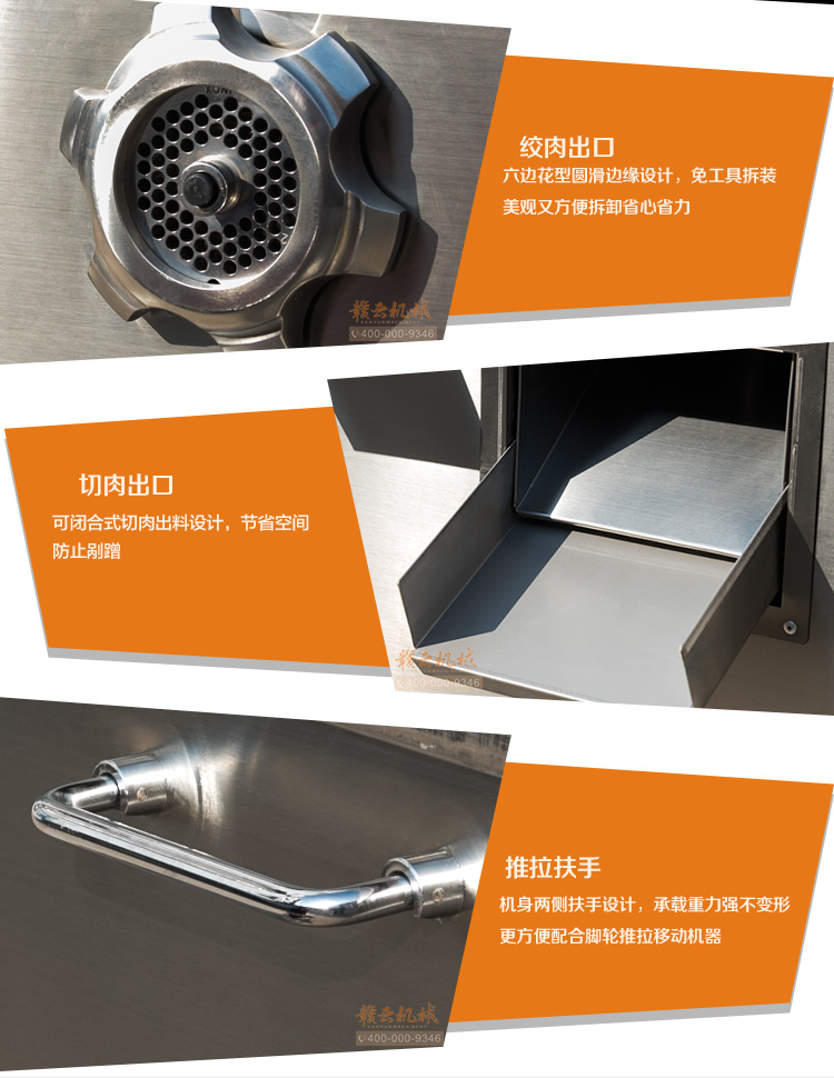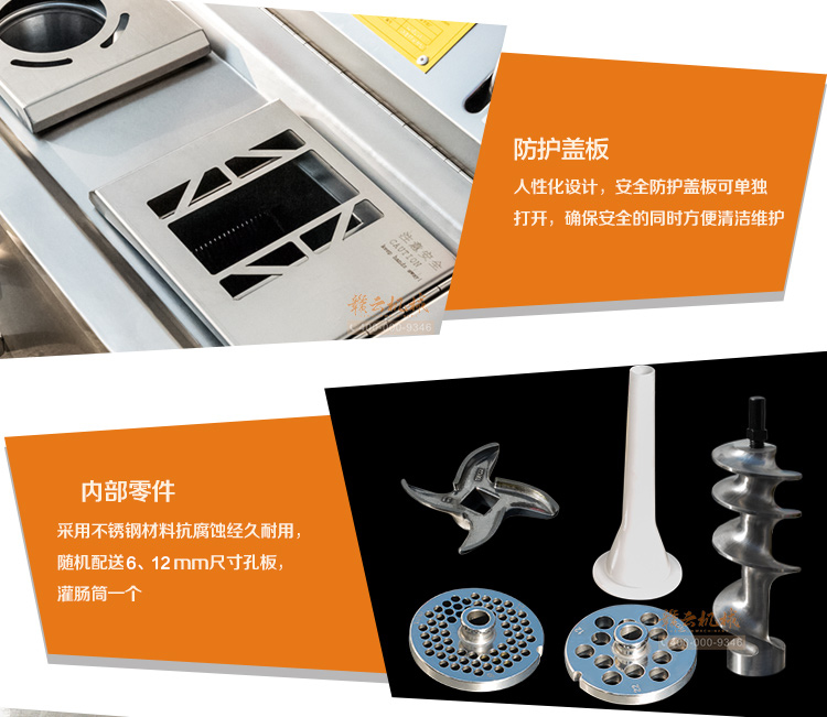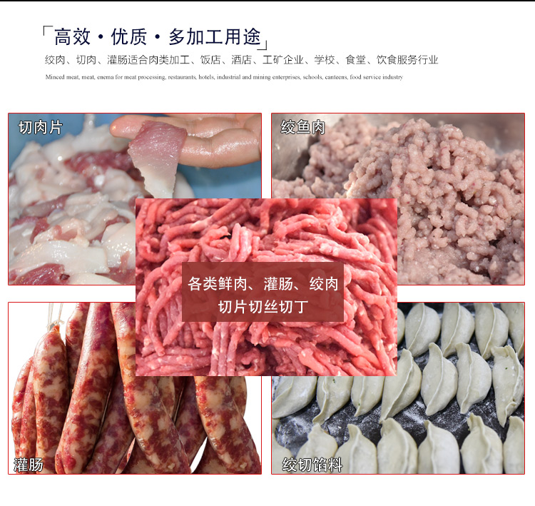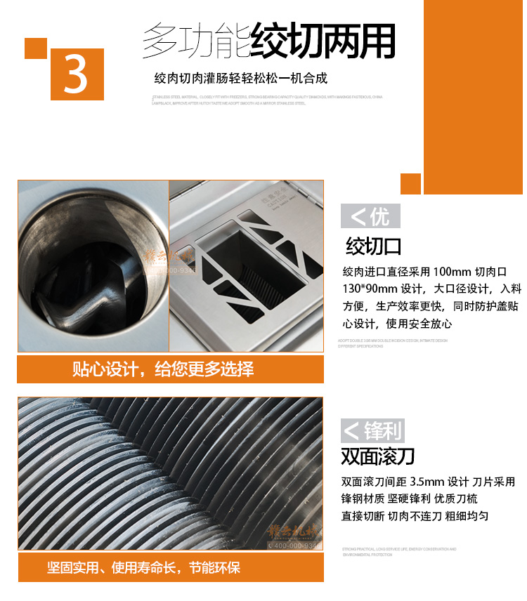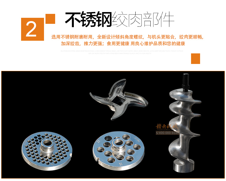 本機采用304不銹鋼板材封裝設(shè)計,絞肉十字刀、絞龍及圓刀采用201不銹鋼材質(zhì),切肉刀采用特殊加硬鋼材,激光開刃鋒利耐用,雙滾切肉效果好,肉片規(guī)則均勻。不銹鋼絞龍絞齒深,咬力更大,絞肉更強勁,離合開關(guān)設(shè)計,操作方便耐用。